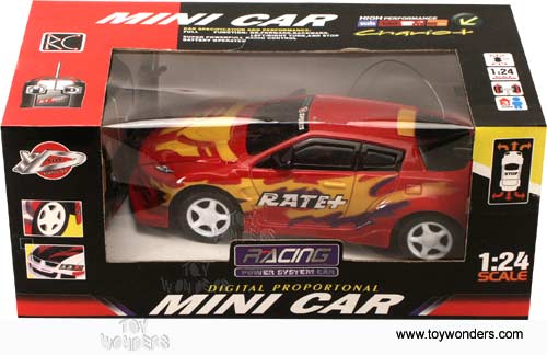 78921/4 Radio Controlled 7F Digital Proportonal Mini Car. 1:24 scale. 7.25" radio controlled car with full function which goes forward, backward, left/right turn, and stop. Racing power system car. 27MHz. Requires 1 "9V" & 3 "AA" batteries. Box size: 9.75"L x 5"W x 4.25"H. Assorted colors. 24 pcs per inner box.