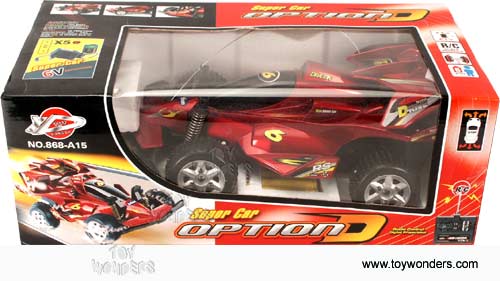 868A/15 R/C 7F Super Car Option D. 12" radio controlled car with full function which goes forward, reverses, left/right turn and stop. 27MHz. Requires 5 "AA" batteries and 1 "9V" battery and recharger (included). Box size: 15.25"L x 7.75"W x 5.75"H. Assorted colors.