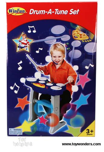 2037M/3 Drum A Tune. 18" tall set include 2 modes: learning play and normal play. With 6 soft drum pads, headset microphone, 8 rhythm selection, echo function, rec/playback option, 6 bright leds, tempo/volume adjuster, drum stick, stand, and stool. Requires 4 "AA" batteries. Box size: 16"Lx 6"Wx 23.75"H.