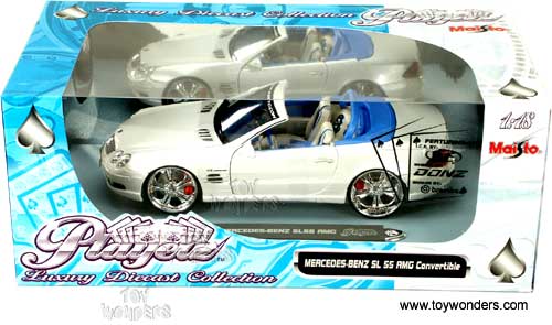31069W MAISTO Playerz - Mercedes Benz SL55 AMG Convertible. 1:18 scale diecast model car. This Benz SL-55 is a 10.5"Lx 4"Wx 2.25"H die cast with opening doors/hood/trunk. This Mercedes-Benz is manufactured by Maisto; ref. no. 31069 in WHITE color. Individually packed in a window box. Box size: 13.75"Lx 7.5"Wx 5.5"H.