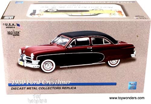 PMUS02R Precision Miniatures - 1950 Ford Crestliner Hard Top. 1:18 scale diecast collectible model car. 12" long die cast metal car. It features a detailed engine and interior. Diecast metal, workable steering, free wheels, opening doors, hood & trunk. Individually packed in a box. Box size: 15"Lx 8.25"Wx 7"H. Manufactured by Precision Miniatures. U.S.A. Models. Ford Official Licensed Product. PMUS02 in RED color with Black top.