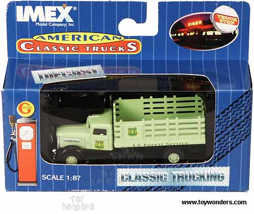 870044 IMEX American Classic Trucks - Peterbilt US Forest Service Stake Pick up Truck. 1:87 scale diecast collectible model car. This Peterbilt pick-up truck is a 3.5"Lx 1.25"Wx 1.25"H die cast metal car with free wheel action. Individually packed in a window box. Box size: 5.75"Lx 1.5"Wx 2.75"H. This Peterbilt pickup truck is manufactured by Imex. 870044 in GREEN color.