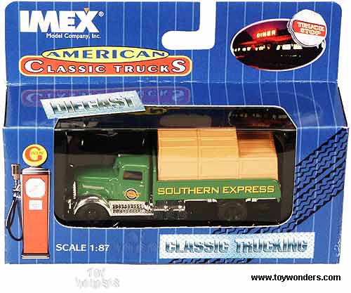870013 IMEX American Classic Trucks - Peterbilt Southern Express Pick Up Truck. 1:87 scale diecast collectible model car. This Peterbilt pick-up truck is a 3.5"Lx 1.25"Wx 1.5"H die cast metal car with free wheel action. Individually packed in a window box. Box size: 5.75"Lx 1.5"Wx 2.75"H. This Peterbilt pickup truck is manufactured by Imex. 870013 in GREEN color.
