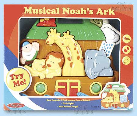 65035T Navystar Toys - Musical Noah's Ark. Battery operated, electronic musical toy. Features 8 character buttons that play animal & other sound effects. Also plays 3 different sing-along tunes. For ages 18 months & up. Try Me features. Batteries included. Navystar. Box measures 8.25"H x 10"W x 2.25"D.