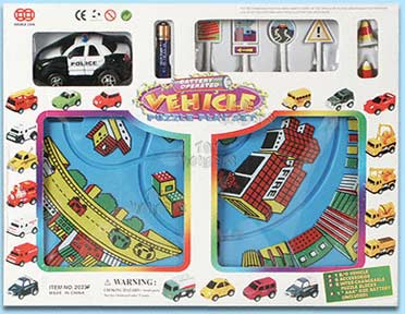 2023F Puzzle Vehicle Set (Police Car). Puzzle set include 1 battery operate vehicle, 6 accessories, 8 inter-changeable puzzle blocks, and 1 "AAA" batteries included. Box size: 12"Lx9.5"Hx2"D.