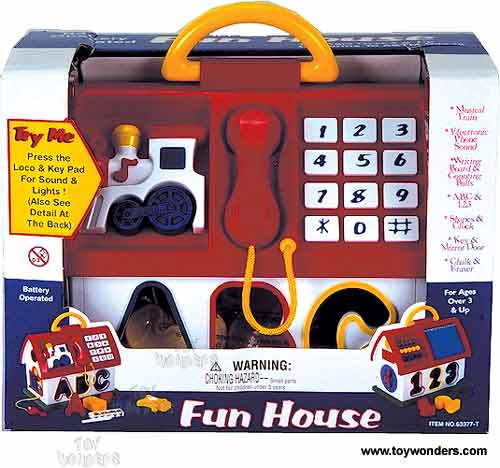 63377T Press Down Fun House 12" musical house. includes phone, sounds, writing board, chalk, eraser. fit shapes into their holes. conforms to ASTM D4236. in a TRY ME box. includes 2 "AA" batteries. Navystar Toys.