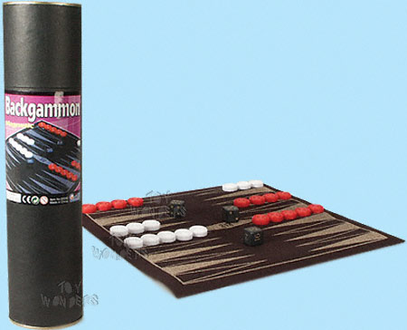 50030 Backgammon. 12" cylinder tube contain a 11" x 11" roll out backgammon mat and backgammon pieces.