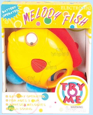 3121F Melody Fish 6" fish that plays eight melodies and fish swimming sounds. in a TRY ME box. includes 2 "AA" batteries. 12 pcs/inner.box size: 8"Lx6.5"Wx2.5"H.
