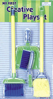 301R My First Creative Play Set. This cleaning set includes a 20" broom, 20" mop, 8" hand broom, and 8" dustpan. Blister card size: 22" x 12", 12 pcs/inner.
