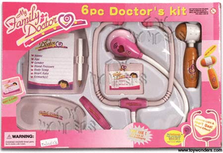 6394 My Family Doctor 6 Piece Play Set. Includes: stethoscope, reflex hammer, tweezers, kidney basin, staff ID card and clipboard. Box size: 15"L x 1.5"W x 10"H. 12 pcs/inner.