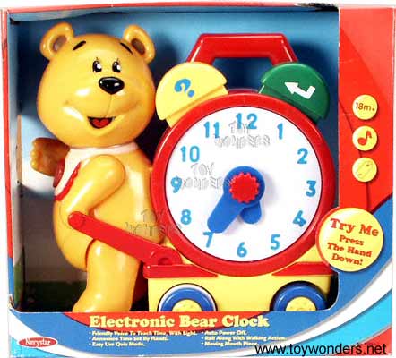 65053T Navystar Toys - Electronic Bear Clock. Battery operated play clock with moving mouth piece, announce time set by hands, roll along with walking actions. Includes 3 "AA" batteries.