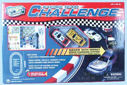 32820 Racing Team Challenge (20 foot track). Set includes two 4.5" powered cars, over 20 feet of track, track decals and racing rules. Racer with speed changing system. Each vehicle requires 2 "AA" batteries. Additional vehicle is available separately. Please refer to item #32800/12. Box size: 25.75"W x 17"H x 2"D.