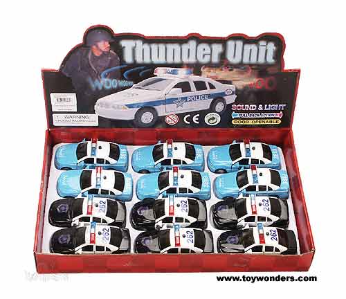 994SL Thunder Unit Police Car. This 4.75" die-cast metal city and state trooper style police cars comes with IC sounds (batteries included) and pullback motor action. 12 pcs per display and in assorted styles and colors. 24 pcs per inner box.
