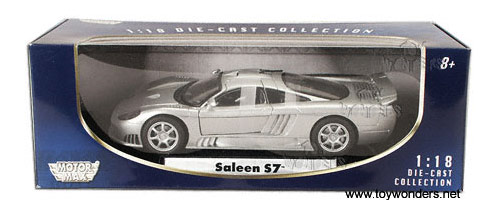 73117SV MOTORMAX Saleen S7. 1:18 scale diecast model car. This Saleen is a 9.75" long diecast with opening doors/hood/trunk and detailed engine & components. Display stand. Manufactured by Motor Max. 73117 in SILVER color. Individually packed in a window box.