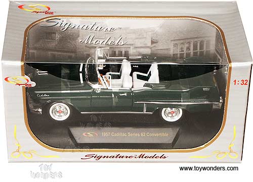 32423GN SIGNATURE MODELS - 1957 Cadillac Series 62 Convertible. 1:32 scale diecast collectible model car. This Cadillac Series 62 is a 6.25"Lx 2.25"Wx 1.75"H die cast metal model car with openable hood, doors & truck. Sits on a display plaque. This 1957 Cadillac Series 62 is manufactured by Signature Models; ref. no. 32423 is in GREEN color. Individually packed in a window box. Box size: 8"Lx 4"Wx 3.75"H. GM is a trademark of the General Motors Corporation.
