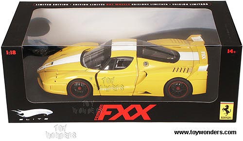 L7123YL MATTEL Hot Wheels Elite - Ferrari FXX. 1:18 Scale diecast collectible model car. This Ferrari FXX is a 10"Lx 4.25"Wx 2.25"H die cast metal collection car with openable hood, doors & trunk. Sits on a display plaque. This Ferrari FXX is manufactured by Mattel. L7123 in YELLOW color. Individually packed in a window box. Box size: 13.25"Lx 6.75"Wx 5"H.